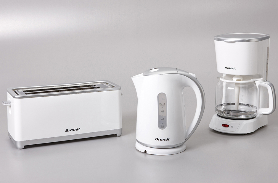 Accordant une attention toute particulière au design de ses produits, Brandt propose des cafetières, bouilloires et grille-pain assortis s’intégrant dans votre cuisine en toute harmonie.